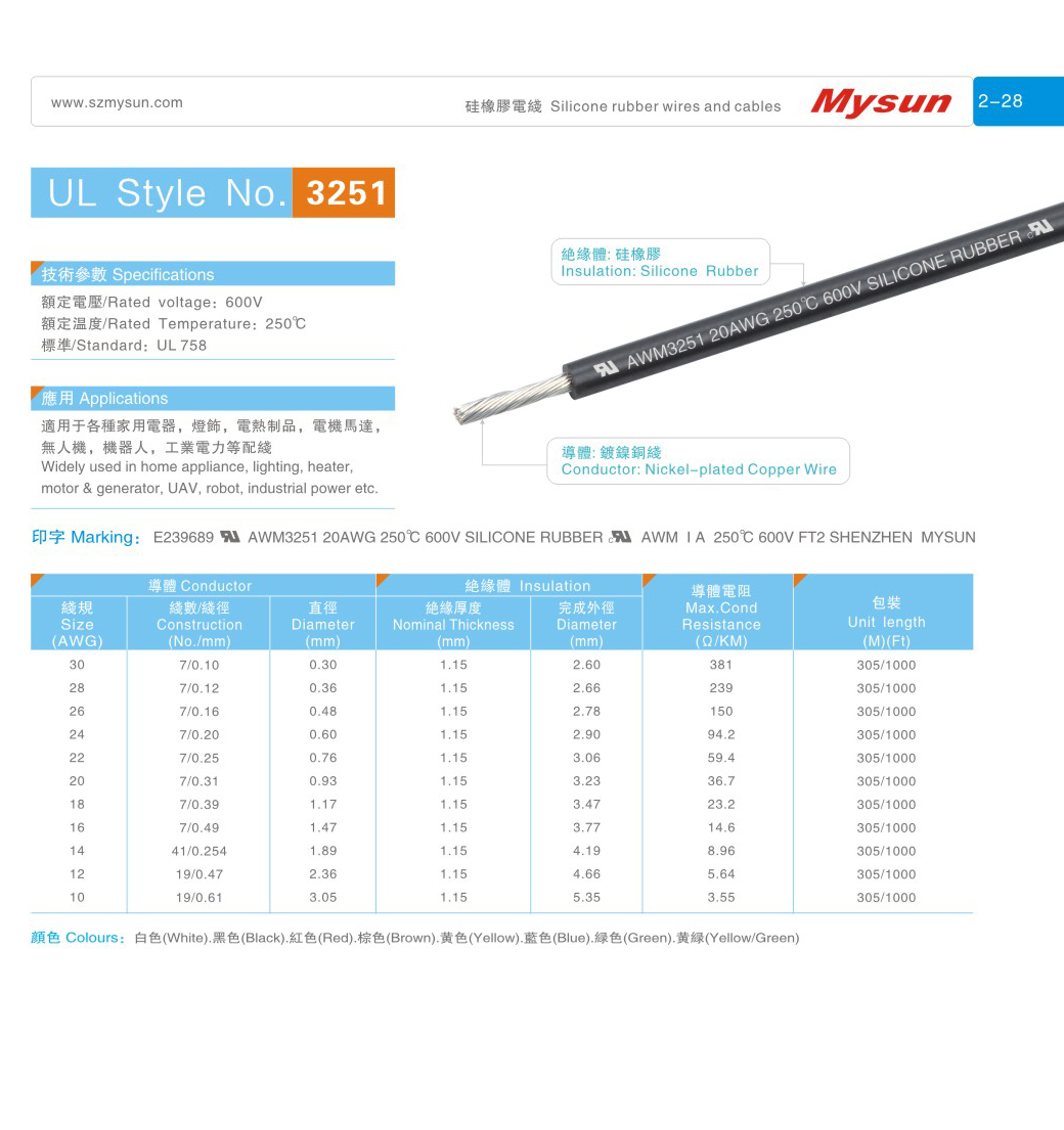 | 線規 Size (AWG)  | 線數/線徑 Construction (No./mm)  | 直徑 Diameter (mm)  | 絕緣厚度 Nominal Thickness (mm)  | 完成外徑 Diameter (mm)  | ||